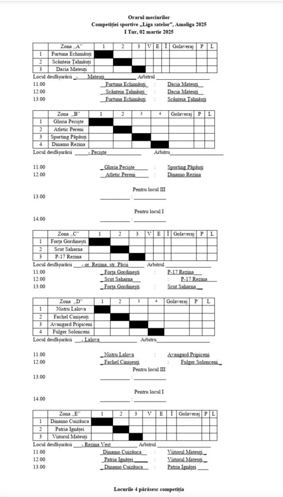 Primele meciuri din cadrul competiției vor avea loc duminică, 2 martie, începând cu ora 11:00. Se anticipează o atmosferă plină de energie și spirit competitiv, cu echipele locale dornice să demonstreze talentul și pasiunea pentru fotbal.